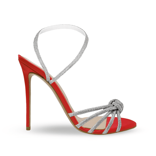 Round toe sandal in satin with knotted headband covered in crystals and 100mm or 120mm stiletto heel
