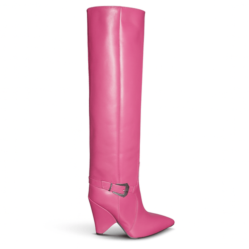 Stivale tubolare a punta sfilata in vera pelle con cinturino e fibbia, tacco medio a cono da 90mm